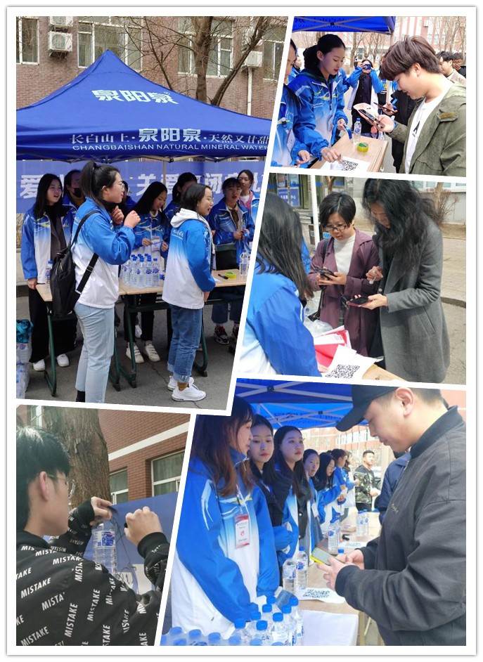 四月的長春雖已步入了春天,但天氣依舊寒冷,盡管志愿者們凍得瑟瑟發抖,但每個成員都積極地參加到活動中,將源自長白山的泉陽泉天然礦泉水送至每個同學手中。